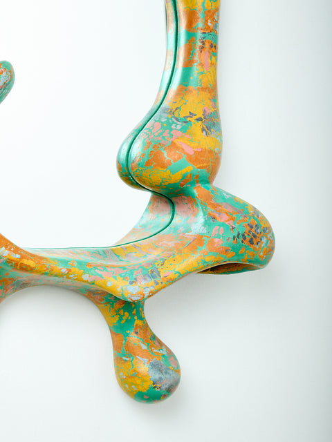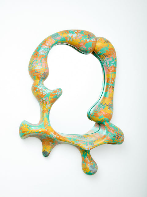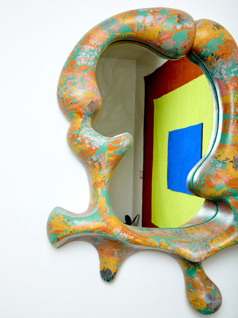 Green and charcoal colorway Iris Mirror by Concrete Cat Someone holds a pink concrete MF Doom mask in front of their face while sitting beside a pink Iris Mirror.