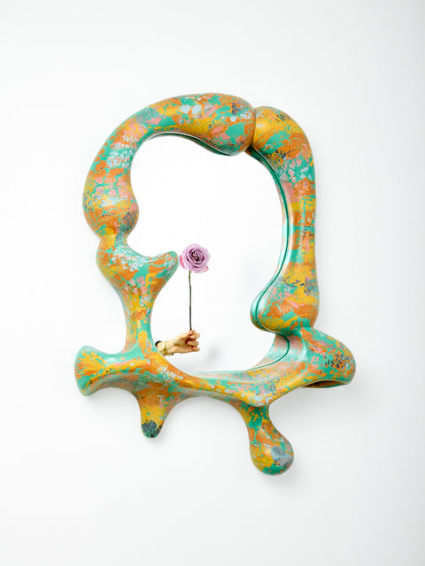 Iris Mirror by Concrete Cat with a wallet and airpods on its curved surface. Someone holds a pink concrete MF Doom mask in front of their face while sitting beside a pink Iris Mirror.