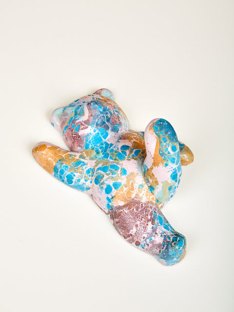 Blue Multicolor Concrete Cat Iris Mirror with a phone and keys resting on its ledge. Someone holds a pink concrete MF Doom mask in front of their face while sitting beside a pink Iris Mirror.