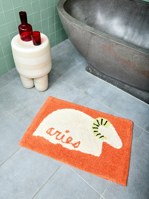 Orange bathmat with ivory bighorn sheep and text that reads "aries" on a tile floor Assorted zodiac-themed bathmats on a bathroom floor and splayed over a bathtub