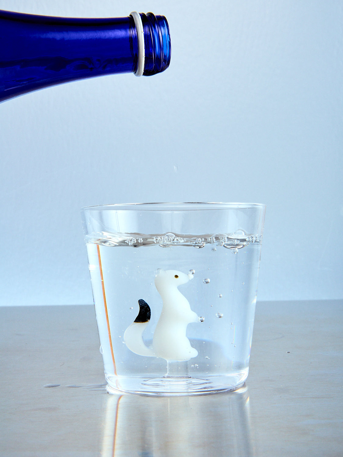 An image shows someone holding a small cup with a duck figure made of glass in the palm of their hand. Someone is pouring water into the cup from a clear bottle.