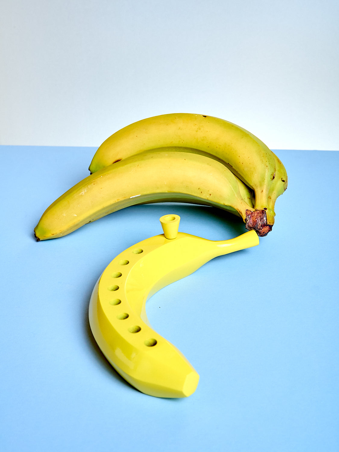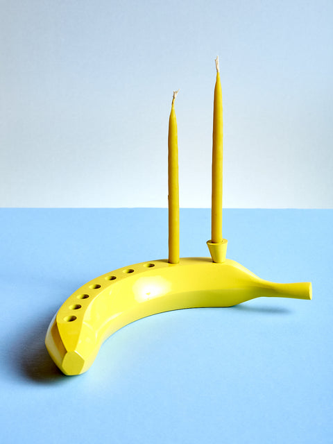 The original Banana Menorah with a pop-art aesthetic. The made-to-be-gifted box doubles as compact storage. Includes the optional Shamash Riser to elevate the ninth candle. Holds standard 5/16 inch Hanukkah candles. Each banana is hand-crafted. There are variations and imperfections in each that make them unique. (Just like real bananas).