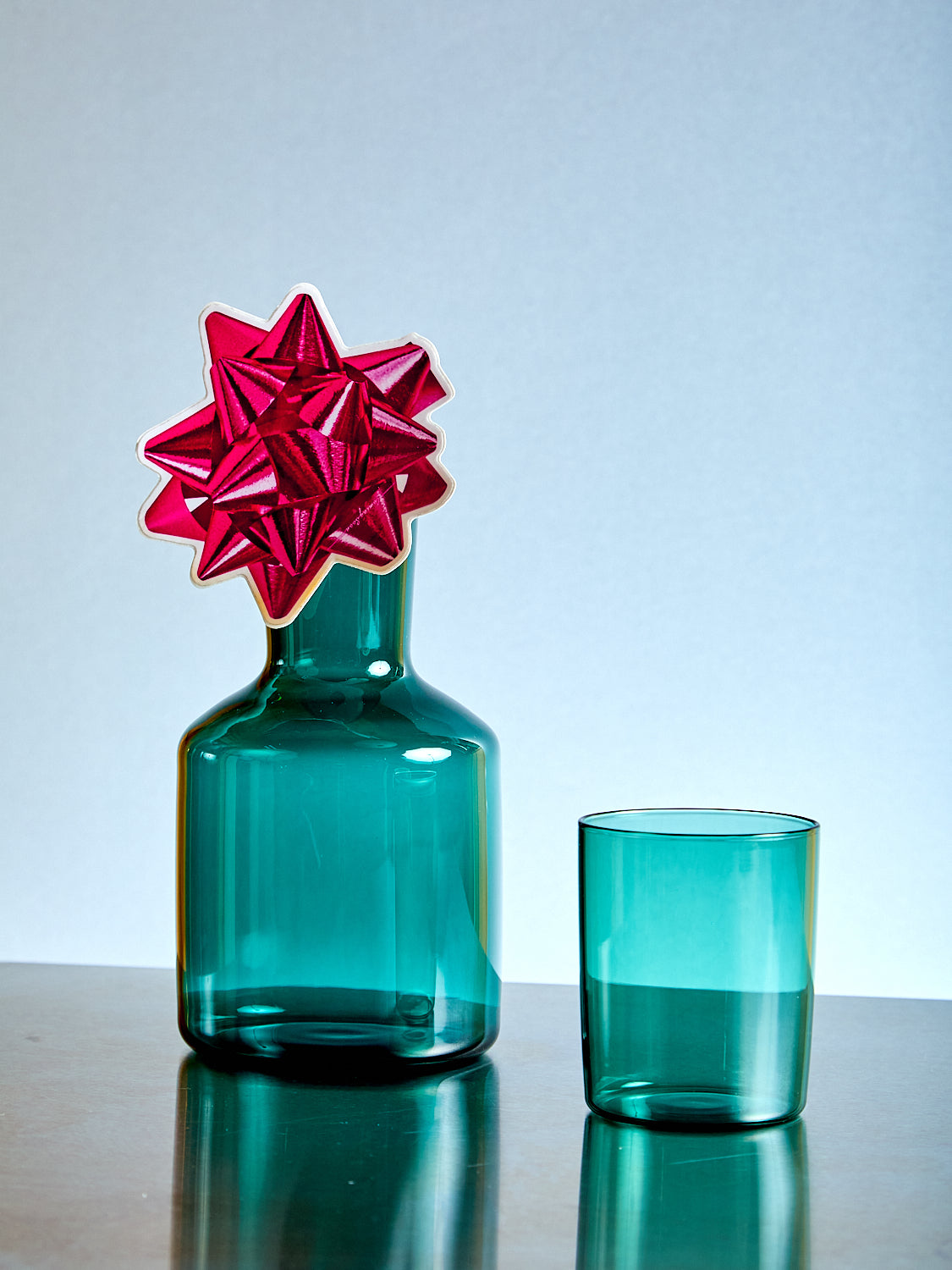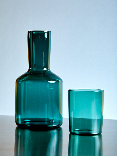 Glass carafe and cup set inspired by traditional French bedside drink ware. An elegant tabletop essential that can be used anywhere as well as sweet flower vase.
