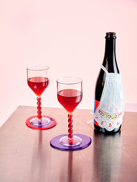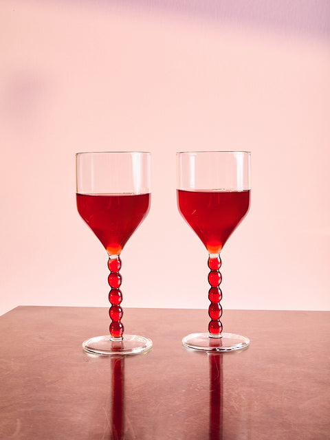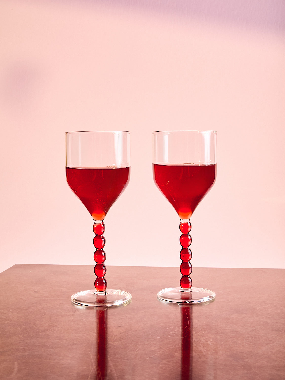 A chalice imagined as a string of pearls, each orb shaped in red borosilicate glass. It rises in playful rhythm, balancing elegance with surreal delight. Fill these wine glasses with your favorite vintage and let it become a piece of jewelry for your table. Available in two colorways, sold as pairs.