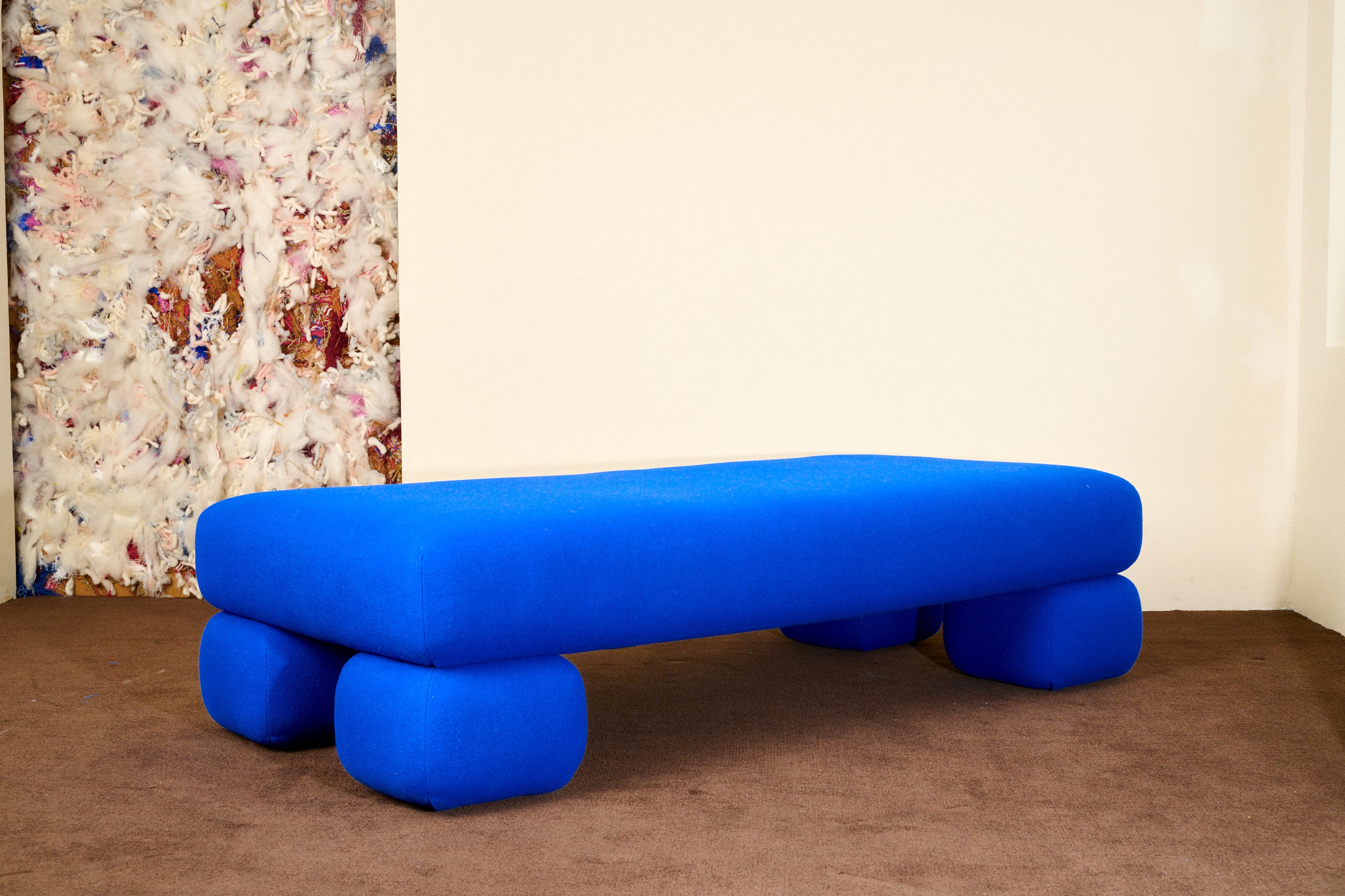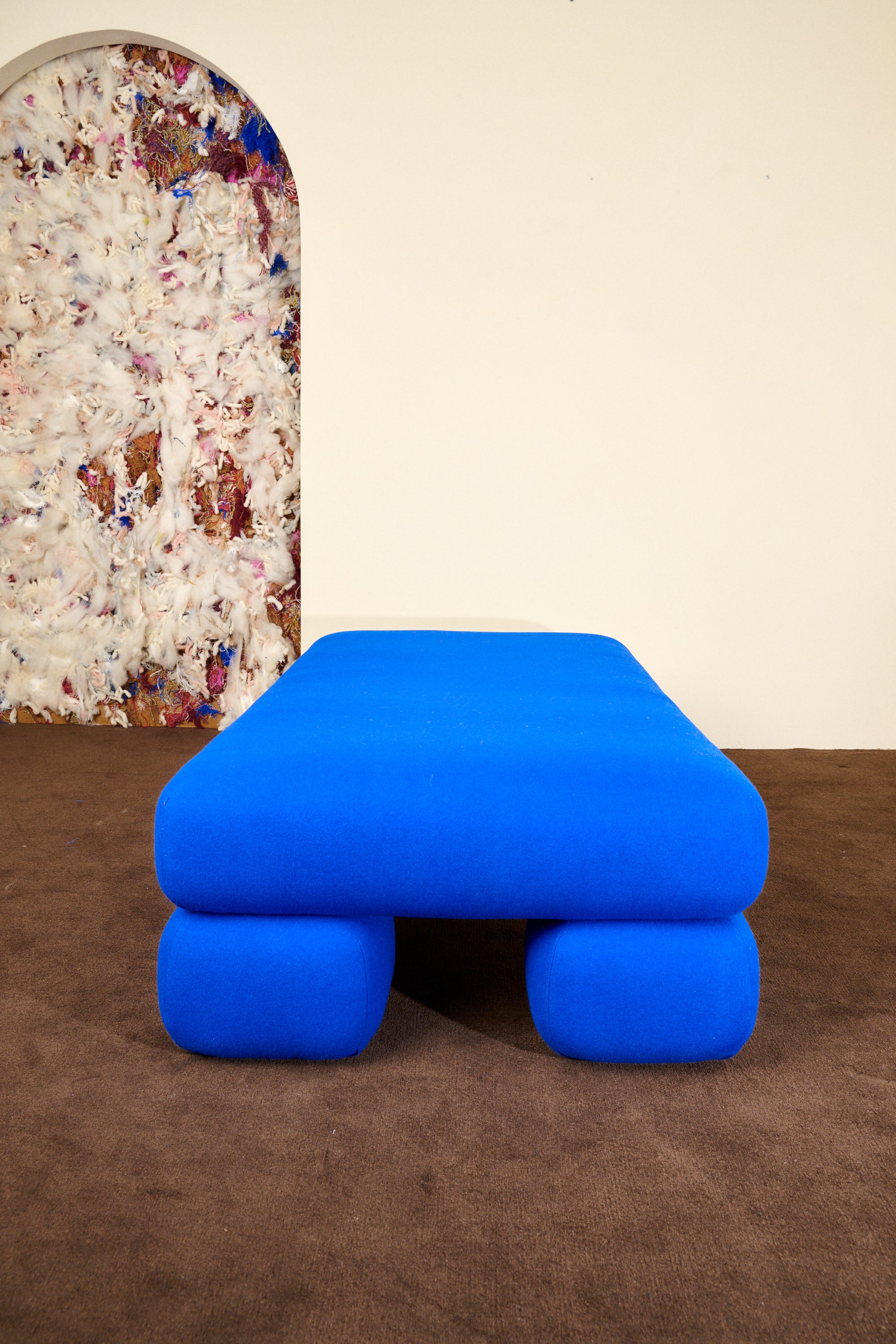 Handmade daybed in dark brown or cobalt blue upholstery. Chunky profile with exaggerated pedestal feet. Incredibly comfortable and plush with a timeless yet unique form. One of a kind piece of furniture. Sold individually.