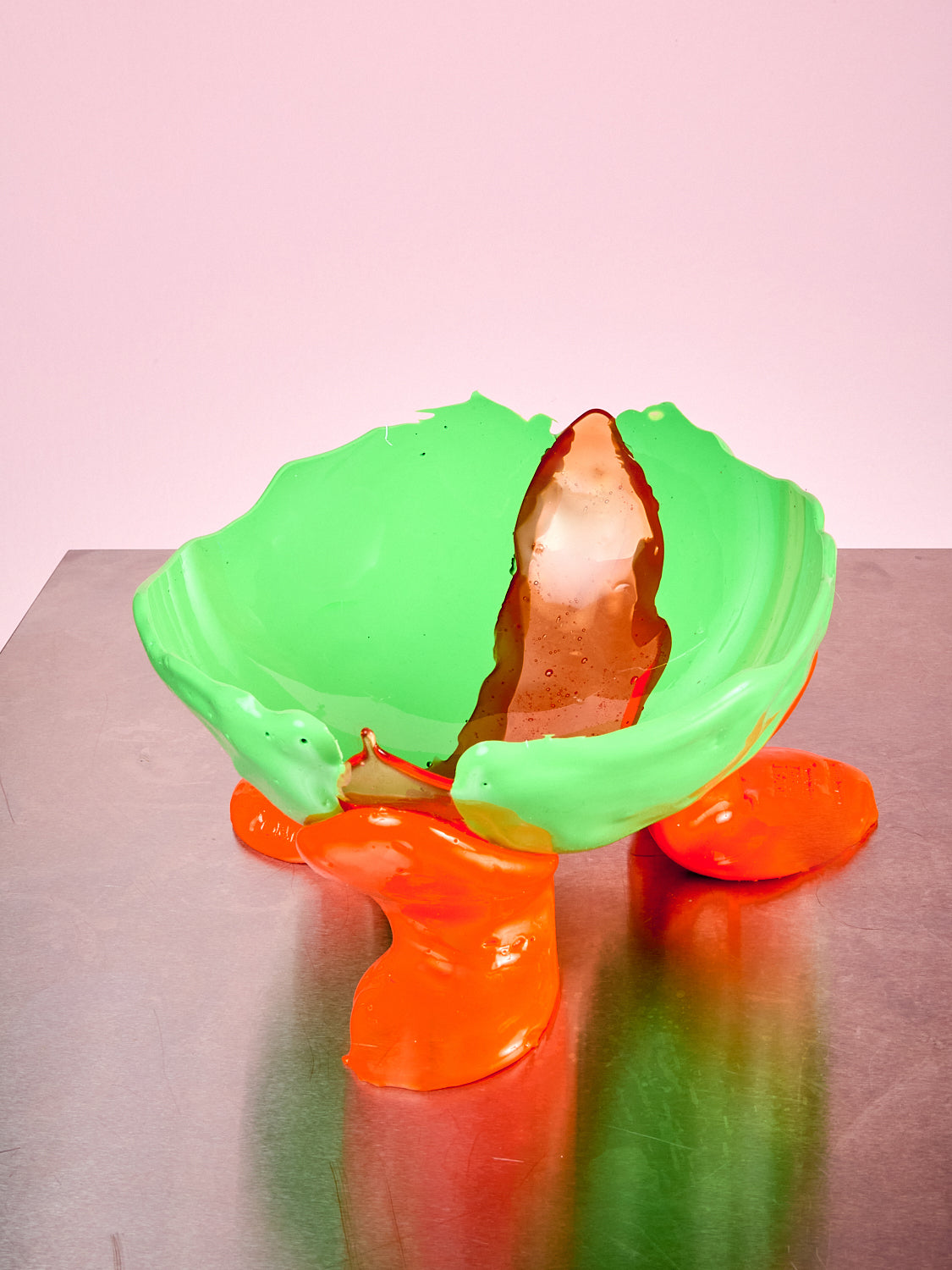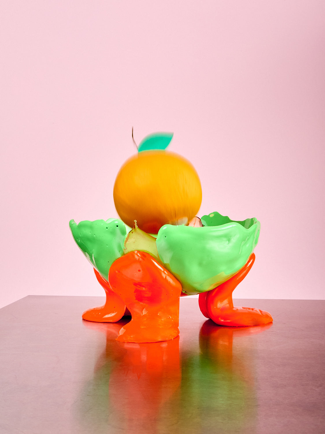 A sculptural resin bowl with blue legs and an amber bowl, handmade in Italy.