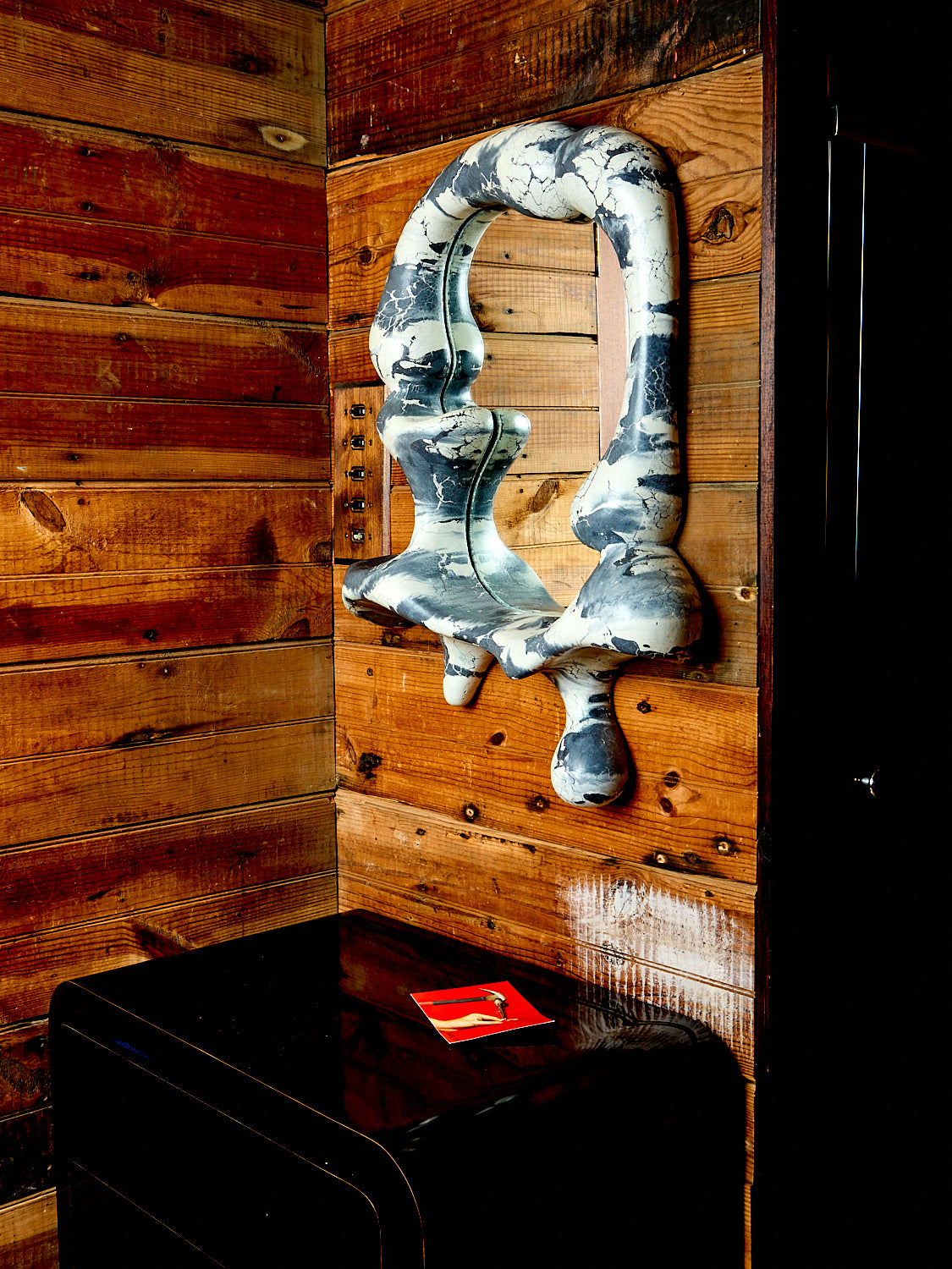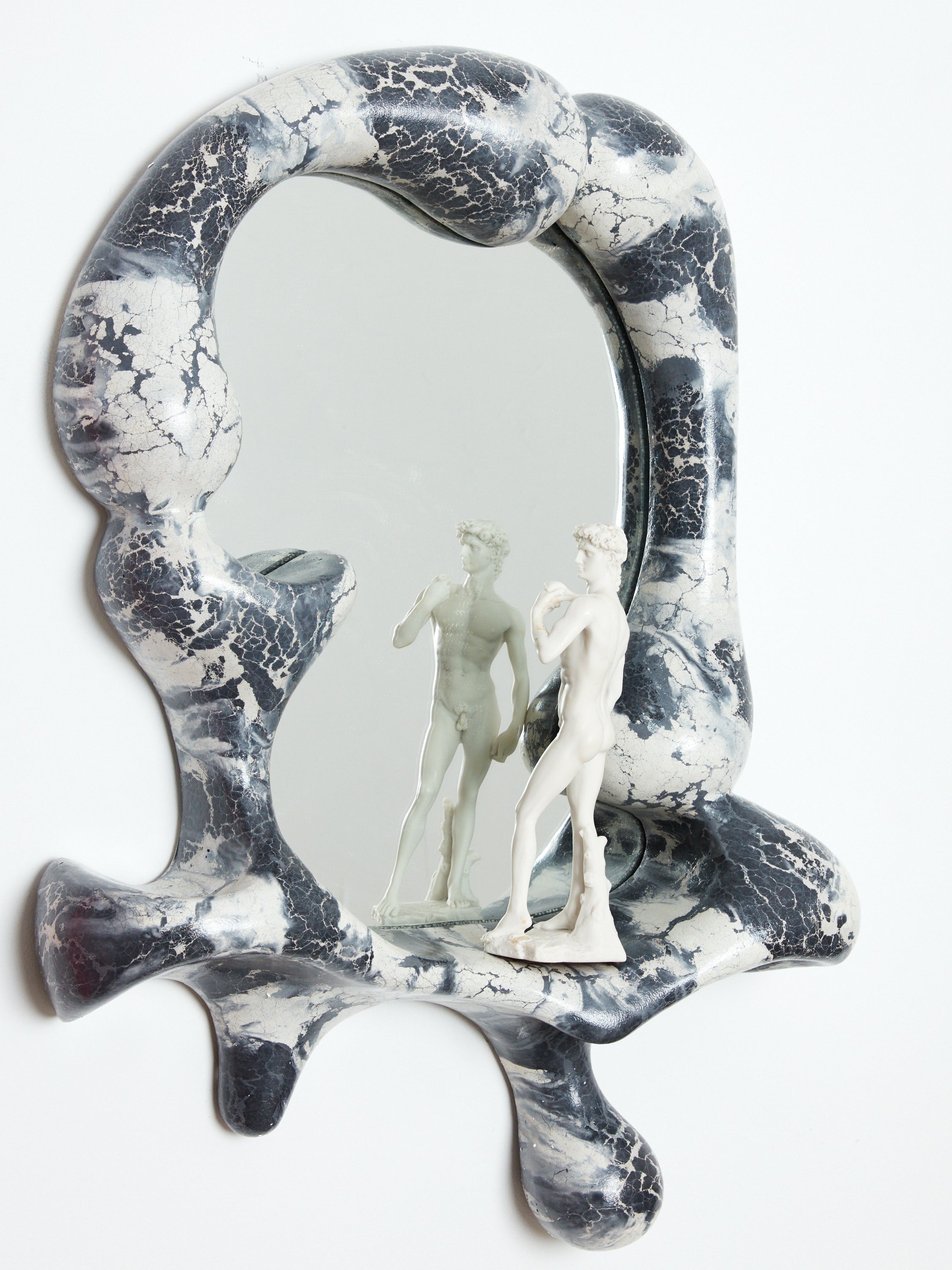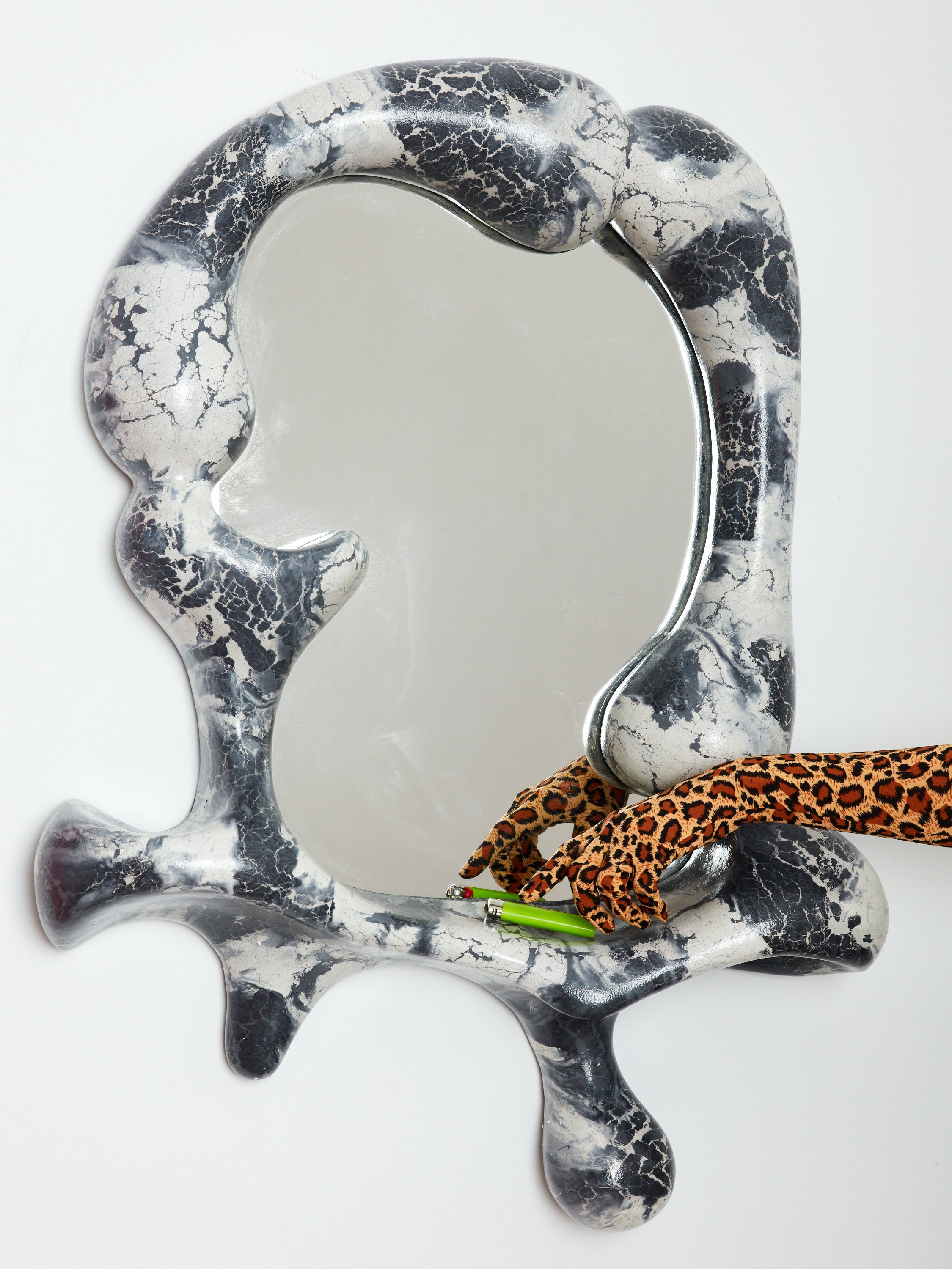Handmade and pigmented concrete mirrors by Concrete Cat. Ingeniously sculptural and strikingly decorative. Organic forms marry to create an impressive and unique form that naturally provides a small ledge to set your phone or keys on. Each piece is casted uniquely so no two pieces will have identical patterning. As artful as it is functional, this mirror would work great in an entryway, living room, or bedroom.