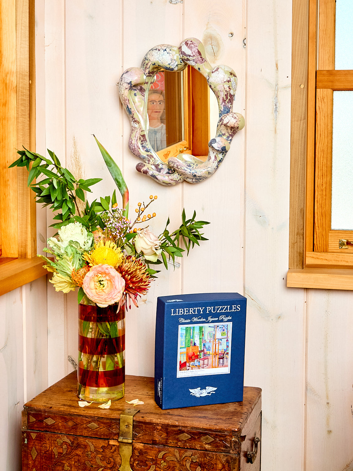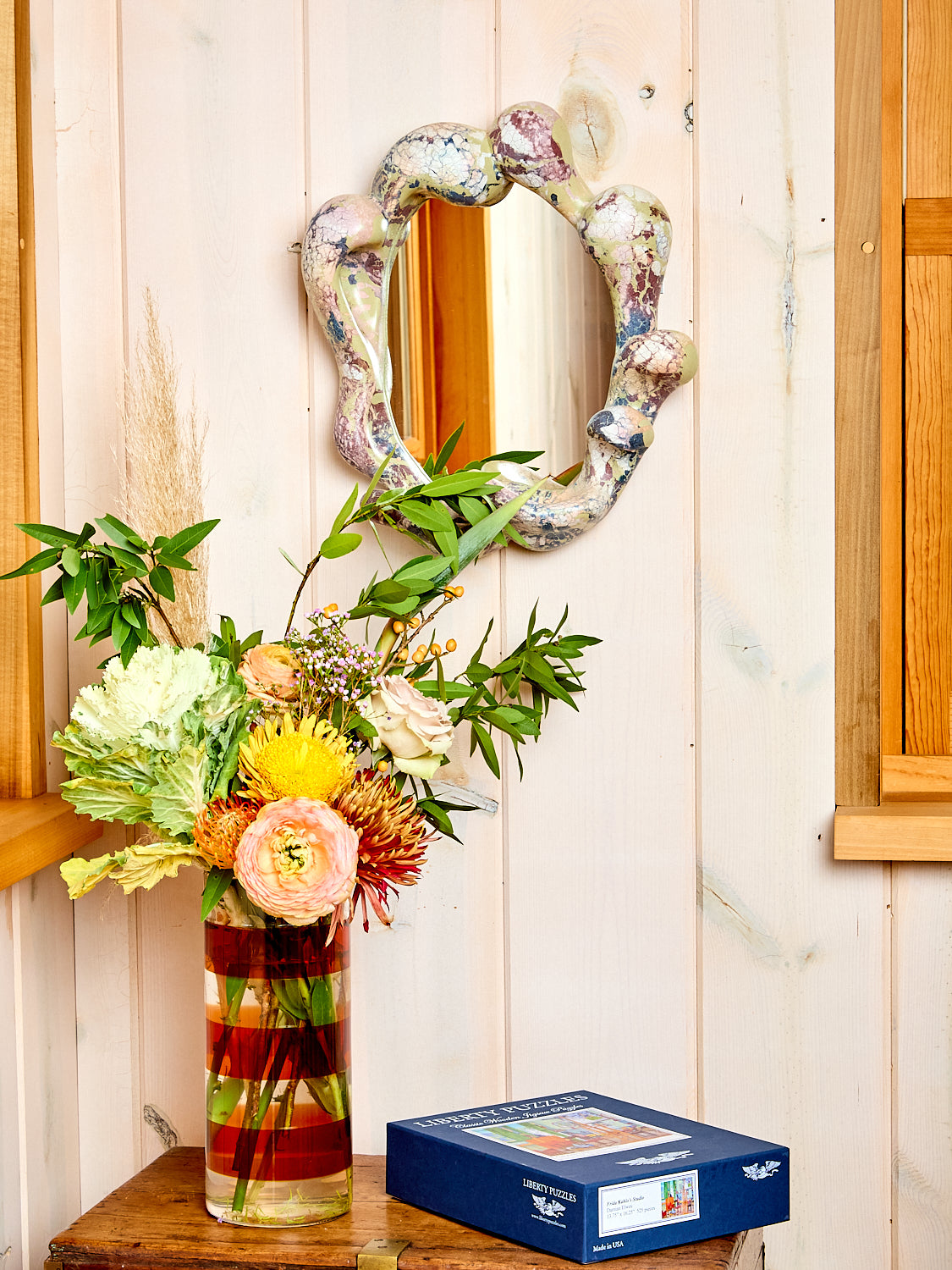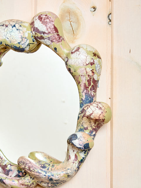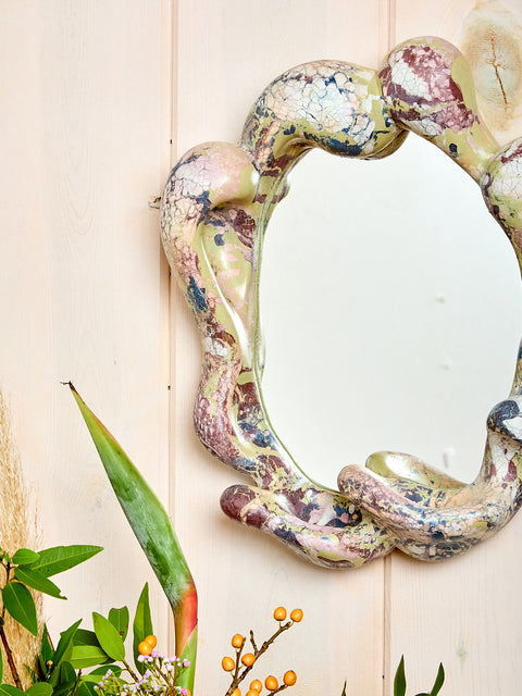 Handmade and pigmented concrete mirrors ingeniously sculptural and strikingly decorative. Organic forms marry to create an impressive and unique form that naturally provides a small ledge to set your little bits. Each piece is casted uniquely so no two pieces will have identical patterning. As artful as it is functional, this mirror would work great in an entryway, living room, or bedroom.