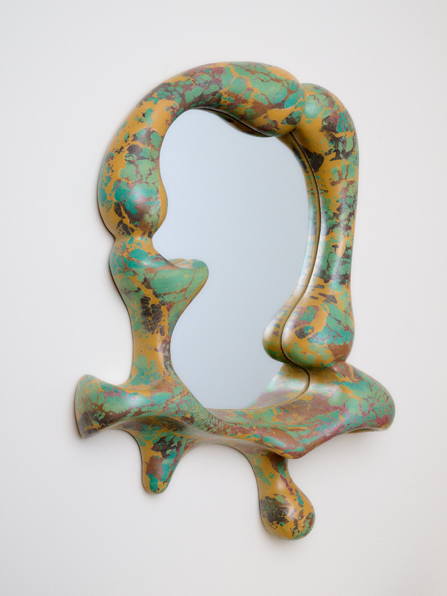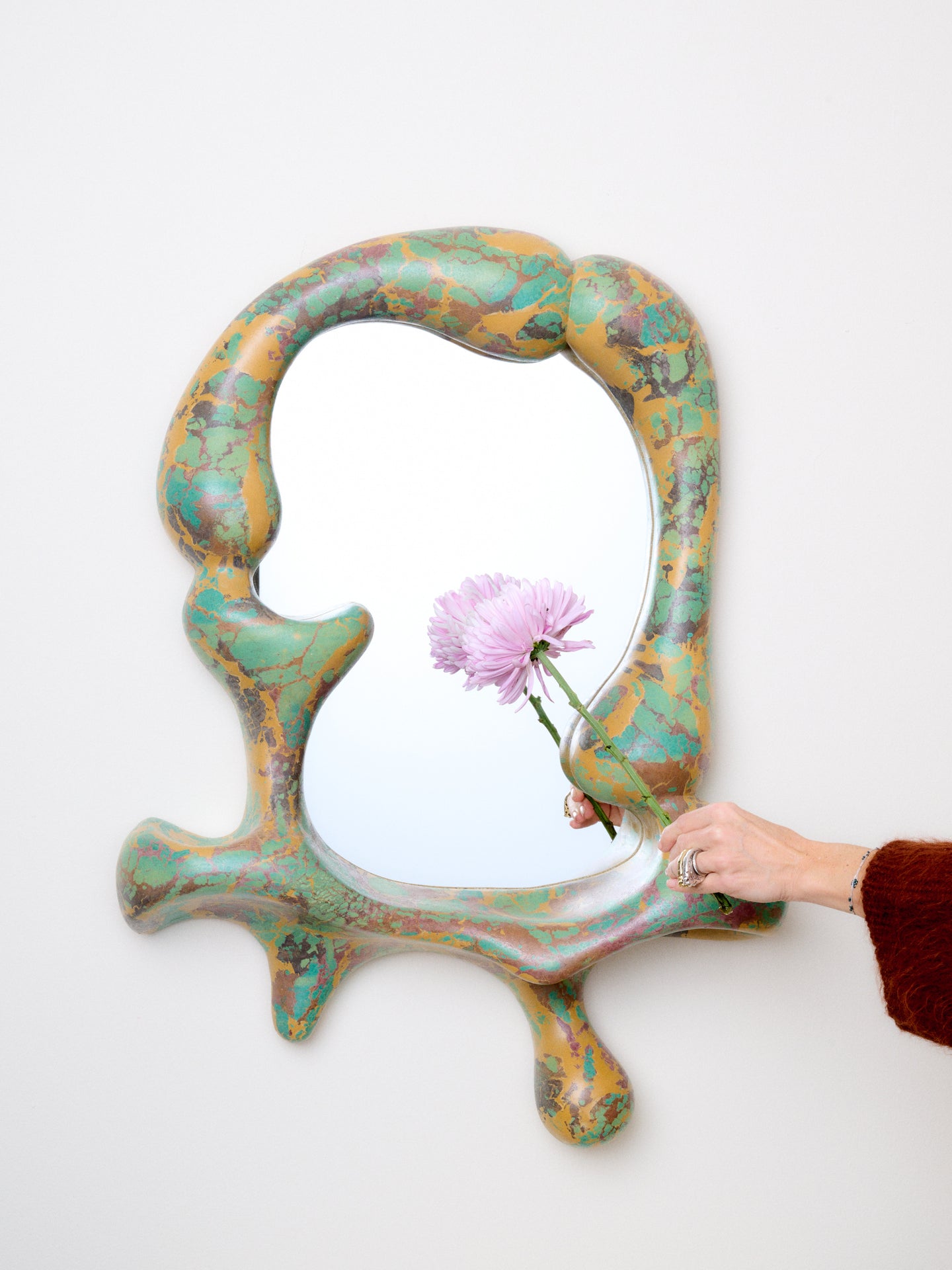 Handmade and pigmented concrete mirrors by Concrete Cat. Ingeniously sculptural and strikingly decorative. Organic forms marry to create an impressive and unique form that naturally provides a small ledge to set your phone or keys on. Each piece is casted uniquely so no two pieces will have identical patterning. As artful as it is functional, this mirror would work great in an entryway, living room, or bedroom.