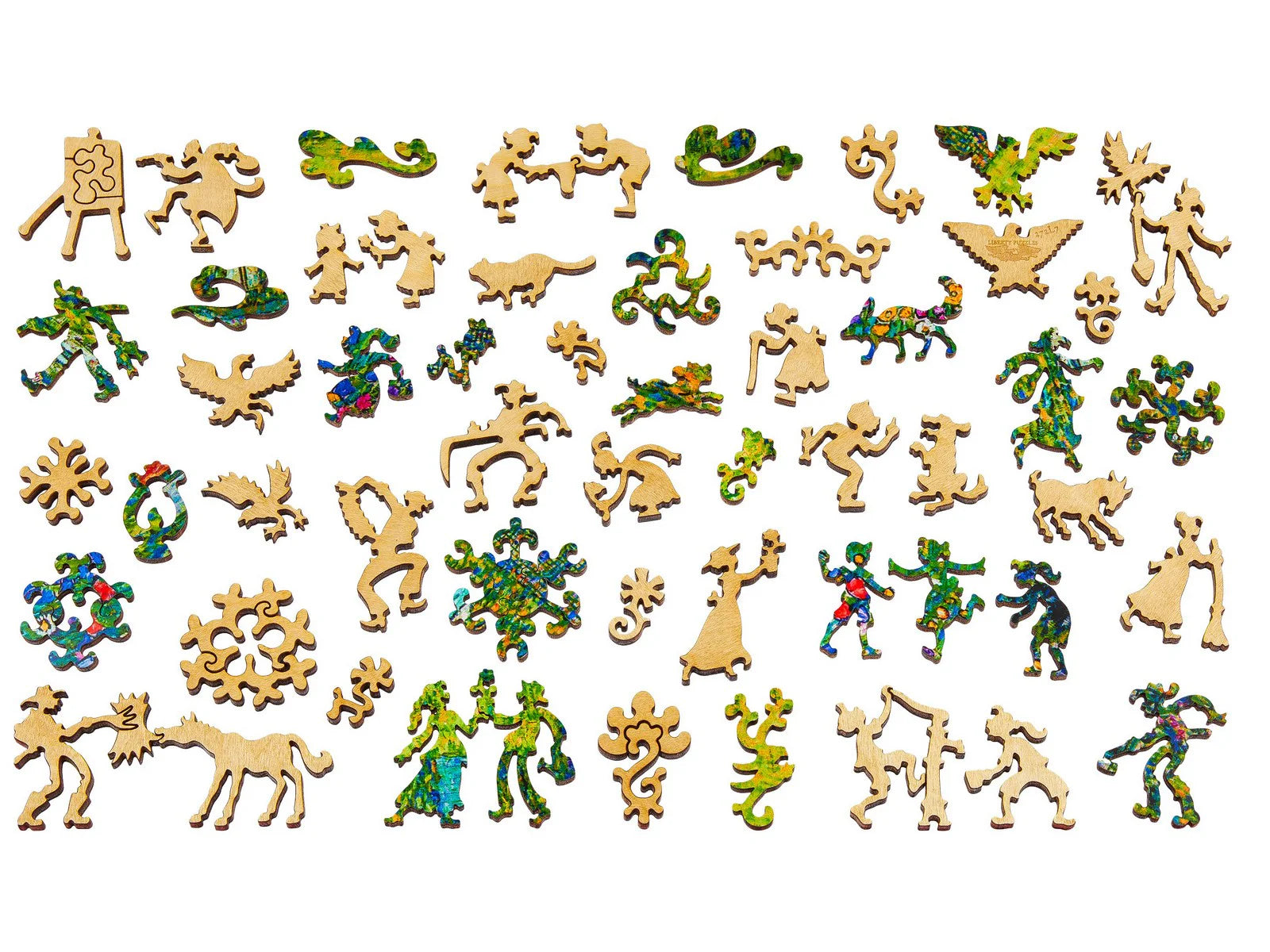 Exquisitely made wooden jigsaw puzzles each uniquely cut with whimsical pieces that tell a story. Each 1/4" thick wooden puzzle piece is intricately cut with a laser, in Boulder, Colorado. Available in artwork for every taste, no two puzzles are completed with the same pieces. Sold individually.