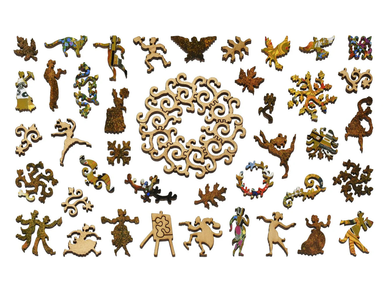 Exquisitely made wooden jigsaw puzzles each uniquely cut with whimsical pieces that tell a story. Each 1/4" thick wooden puzzle piece is intricately cut with a laser, in Boulder, Colorado. Available in artwork for every taste, no two puzzles are completed with the same pieces. Sold individually. This item is final sale.