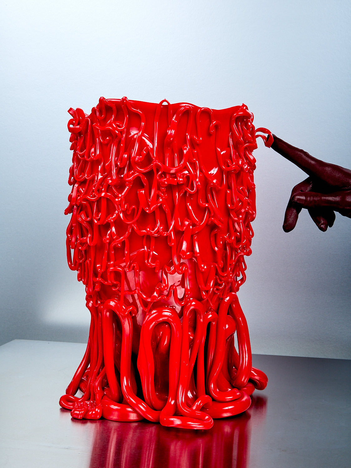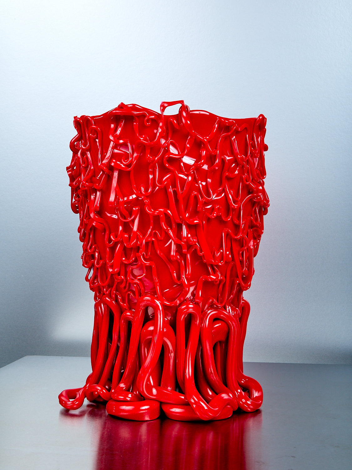 Unique vessel handmade of flexible resin in Italy. Designed by Gaetano Pesce for Fish Design. These sculptural pieces are incredibly pliable while appearing of hard Murano glass. They're fully functional vases but work boldly as a piece alone as well.