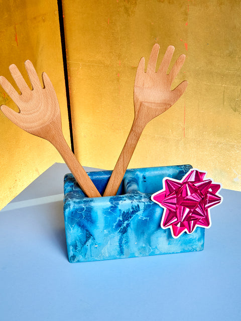 Mini handmade cast-concrete cinder blocks perfect for use as book ends, utensil holders, pen cups, and more. Sold individually, available in various colors.