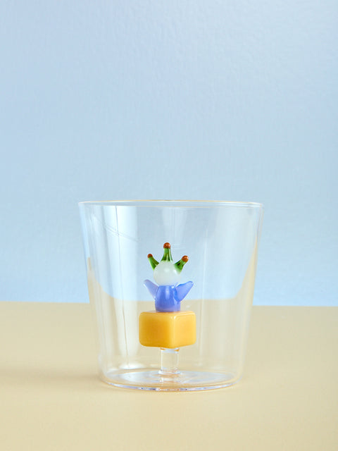 Handcrafted multi colored glass cup, part of the Nutcracker cup collection. Designed by Alessandra Baldereschi. Each charming cup is sure to make you smile and add whimsy to any table setting. Available in a variety of toys, sold individually.