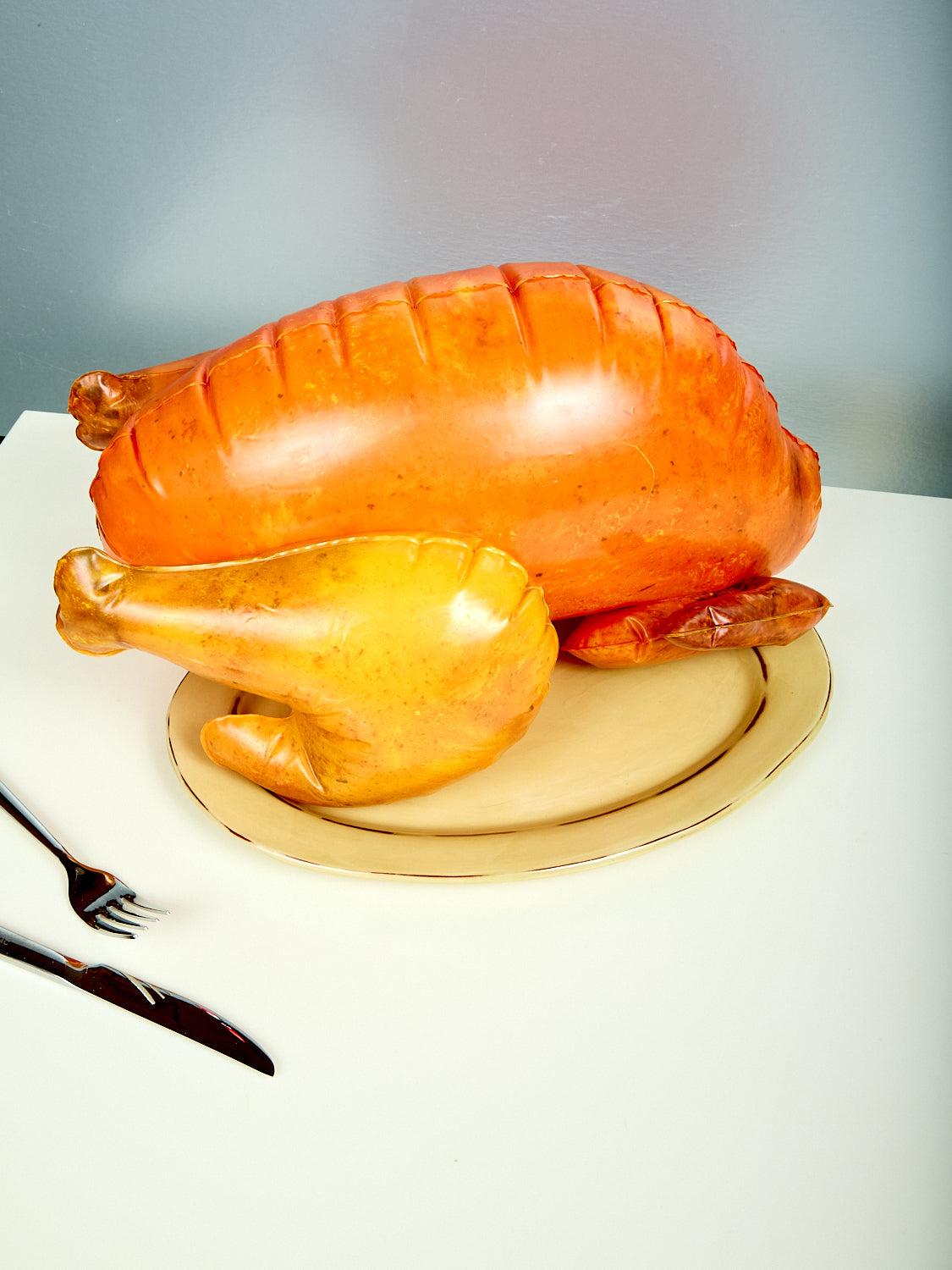 Two white swan servers on a textured beige surface Swan Servers
