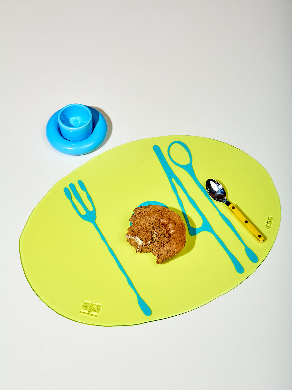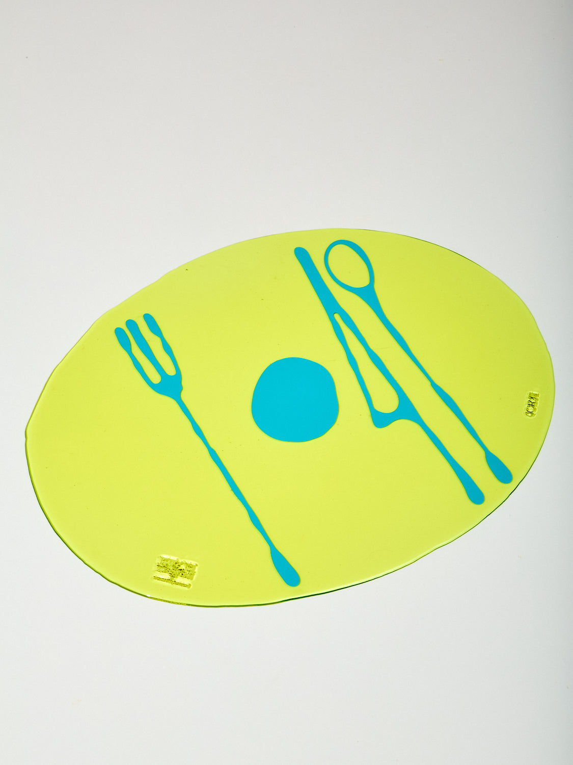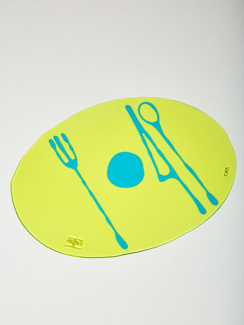 Hand crafted semi-soft resin placemats designed by Gaetano Pesce for Fish Design.  This visionary collection has been made in Italy for over 20 years. The Coming Soon Fruit collection in bold colors with stylized fork, knife, spoon is an easy way to elevate your every day essentials and add some color and fun to your table. *Use code "BUNDLEMAT" for 10% off a set of 4 (mix and match across styles and colors)*