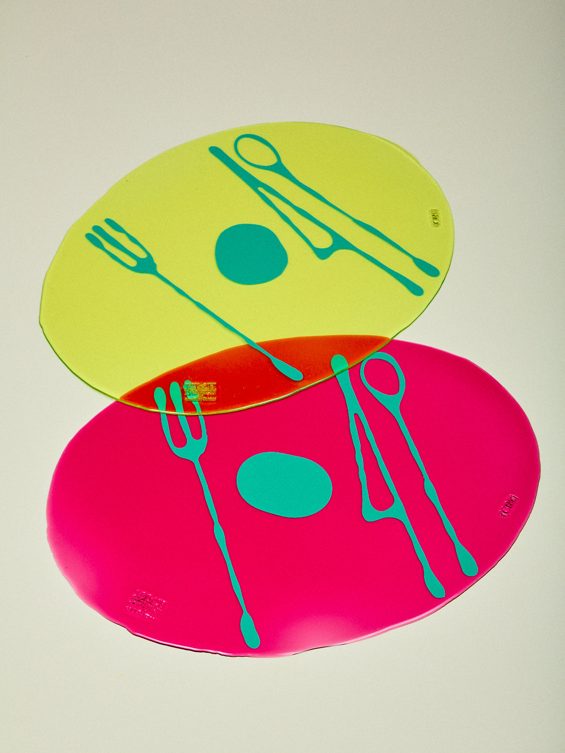 Hand crafted semi-soft resin placemats designed by Gaetano Pesce for Fish Design.  This visionary collection has been made in Italy for over 20 years. The Coming Soon Fruit collection in bold colors with stylized fork, knife, spoon is an easy way to elevate your every day essentials and add some color and fun to your table. *Use code "BUNDLEMAT" for 10% off a set of 4 (mix and match across styles and colors)*