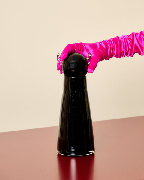Mouth-blown carafe and spherical lid with horns. Each carafe is unique and slight variations might occur. Can also be used as a vase or sculptural accent piece! Available in two colorways, sold individually.
