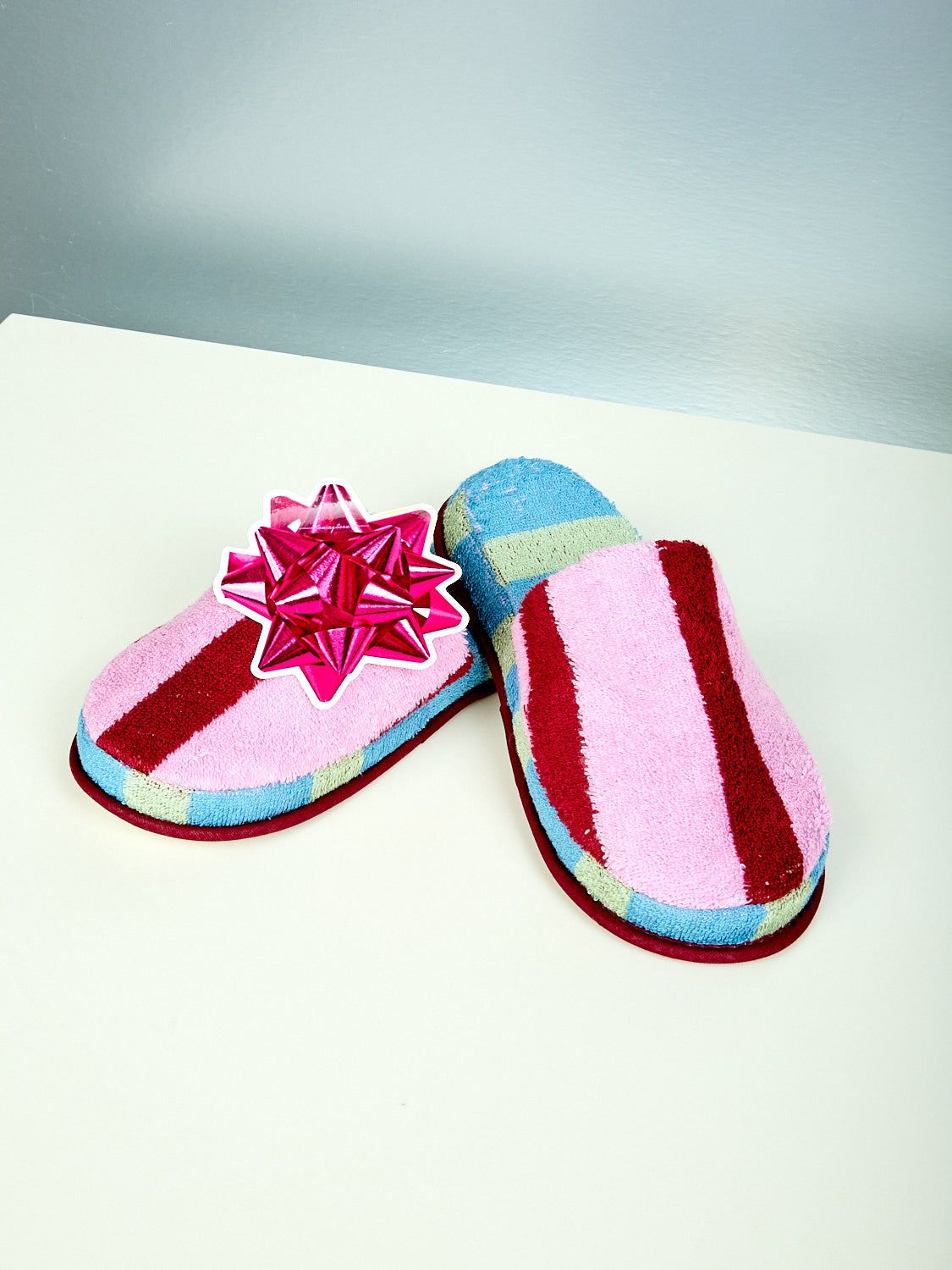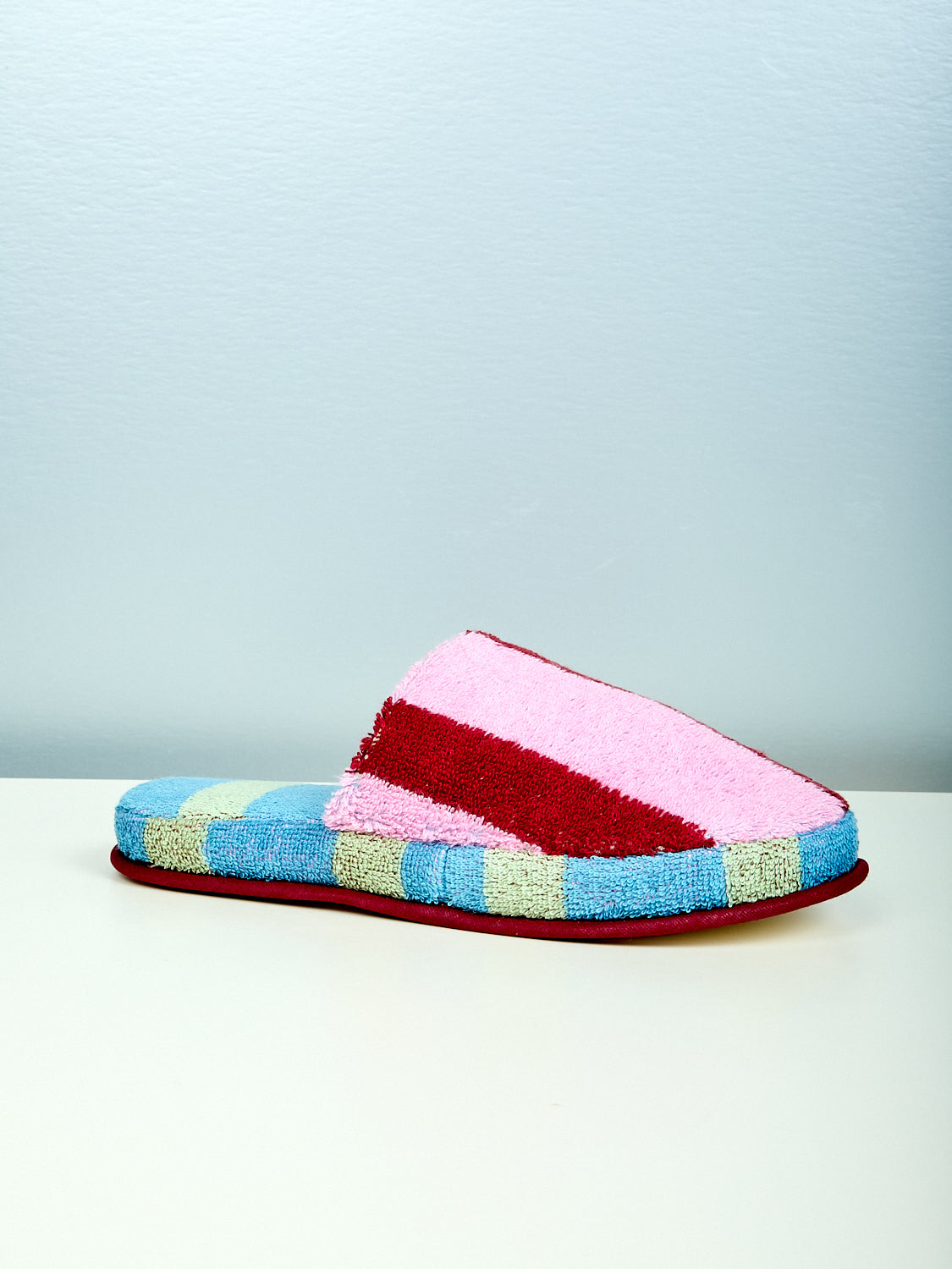 Mais oui, these slippers are, how you say, trés chic? Cotton terry slippers in contrasting stripes and colorways on the outer shell and inner sole.. Matching robes available separately. Available in two colors and two sizes.