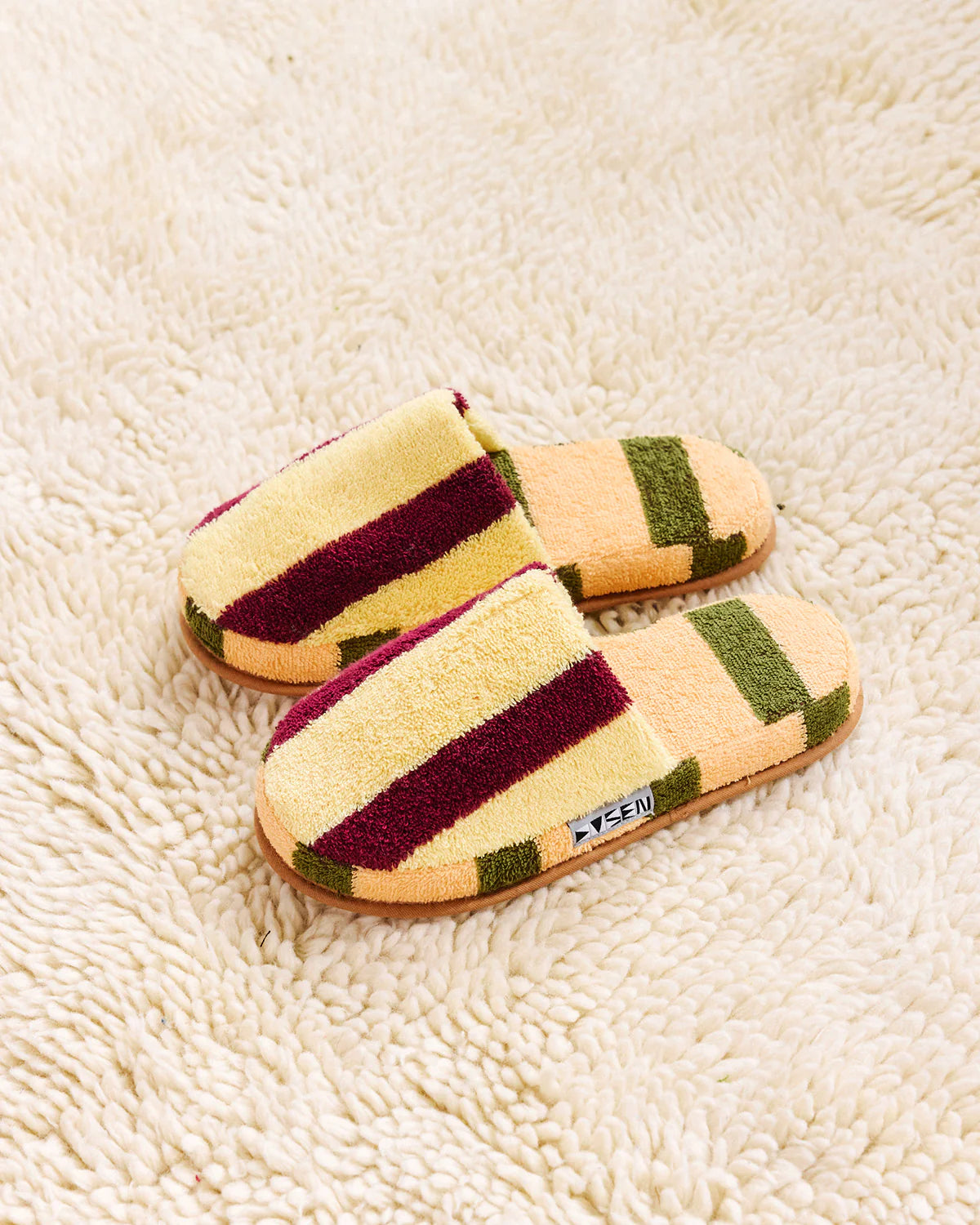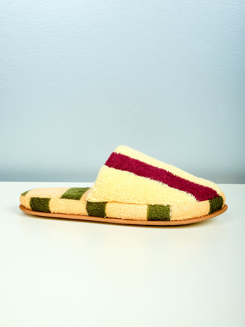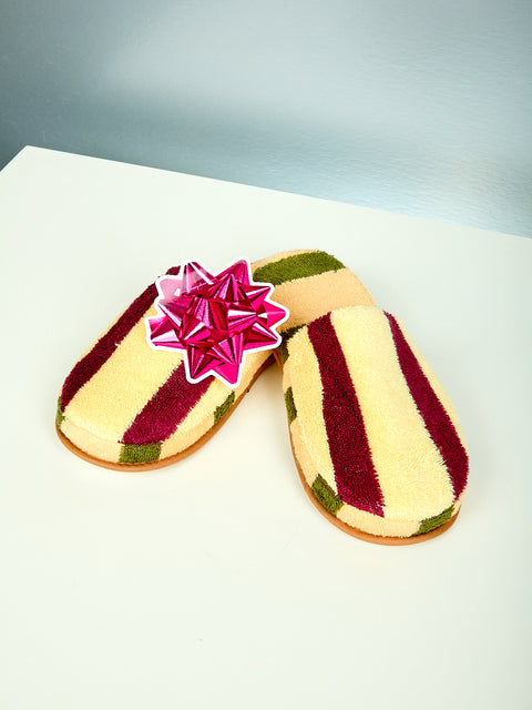 Mais oui, these slippers are, how you say, trés chic? Cotton terry slippers in contrasting stripes and colorways on the outer shell and inner sole.. Matching robes available separately. Available in two colors and two sizes.