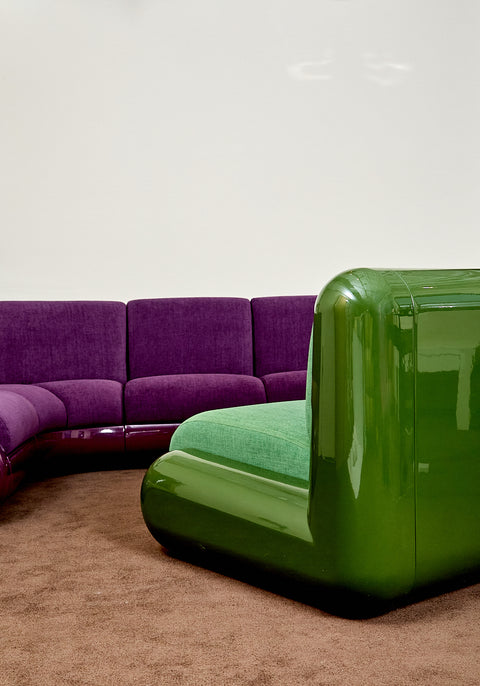 Robust three-part fiberglass seat with lacquered finish with chenille-textured linen upholstery.