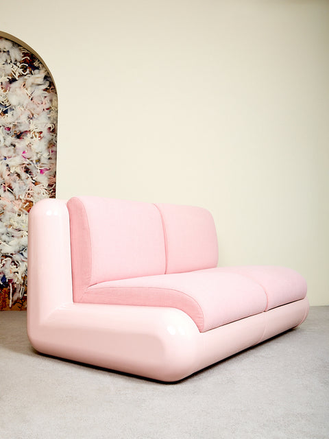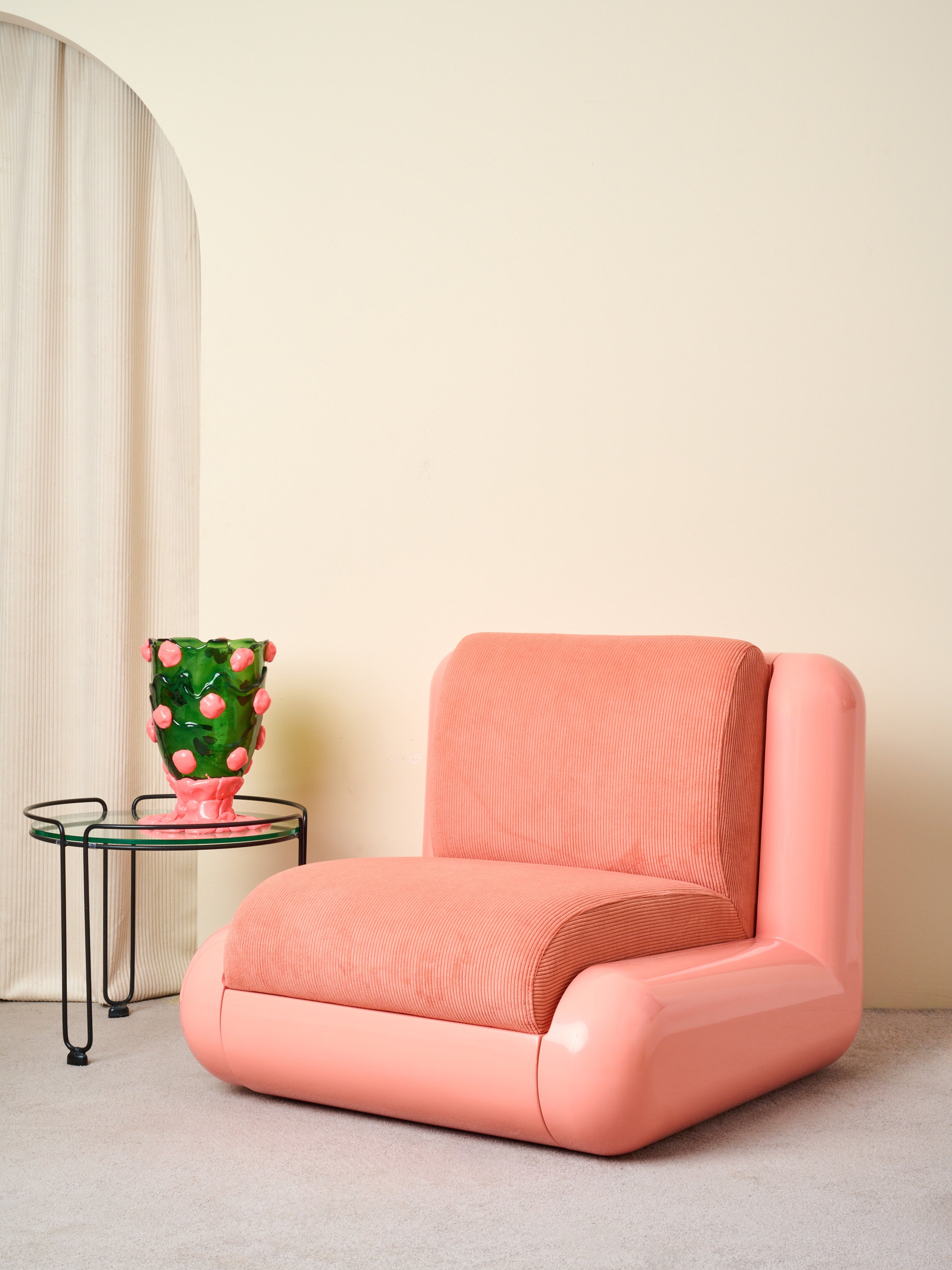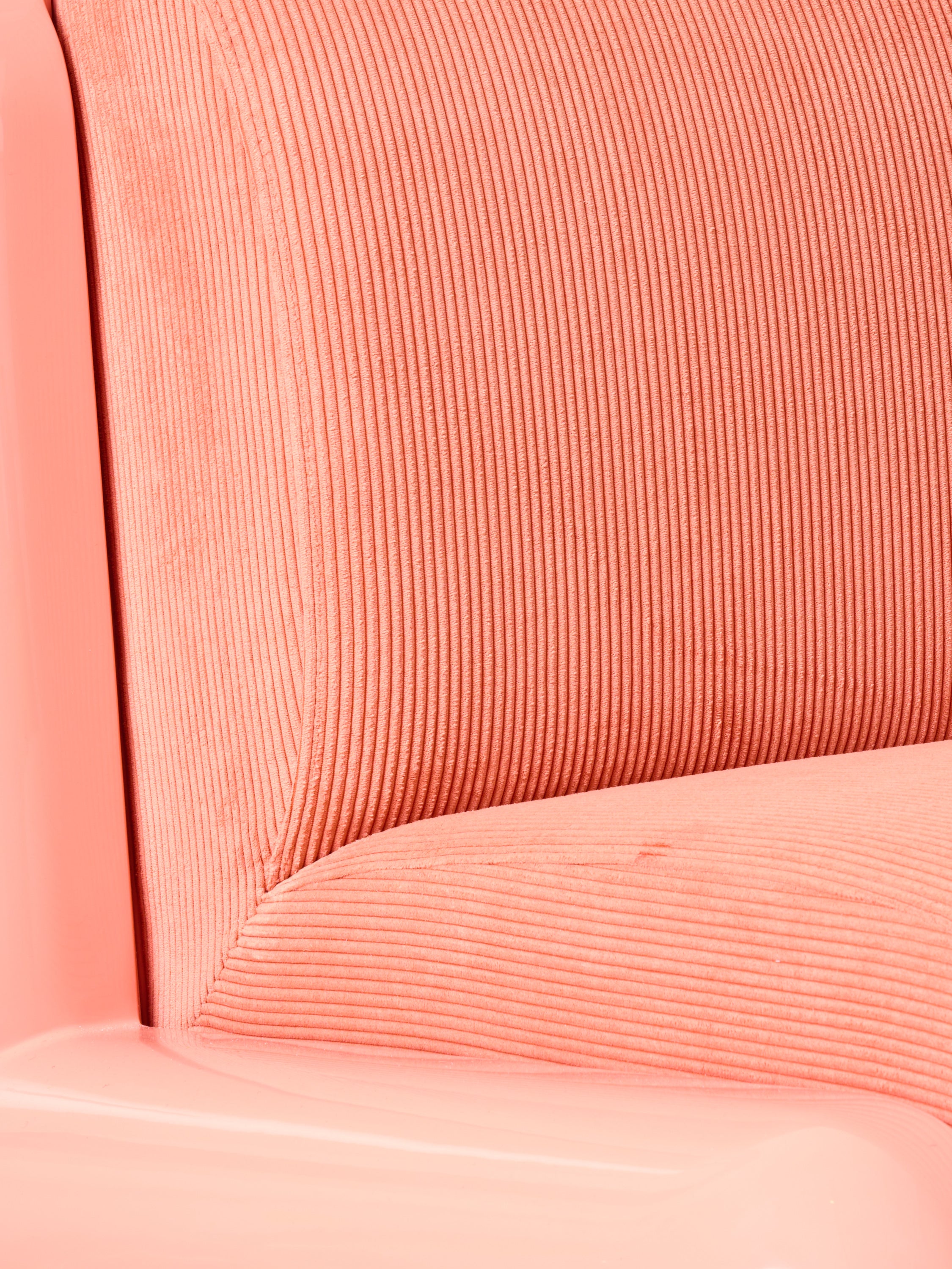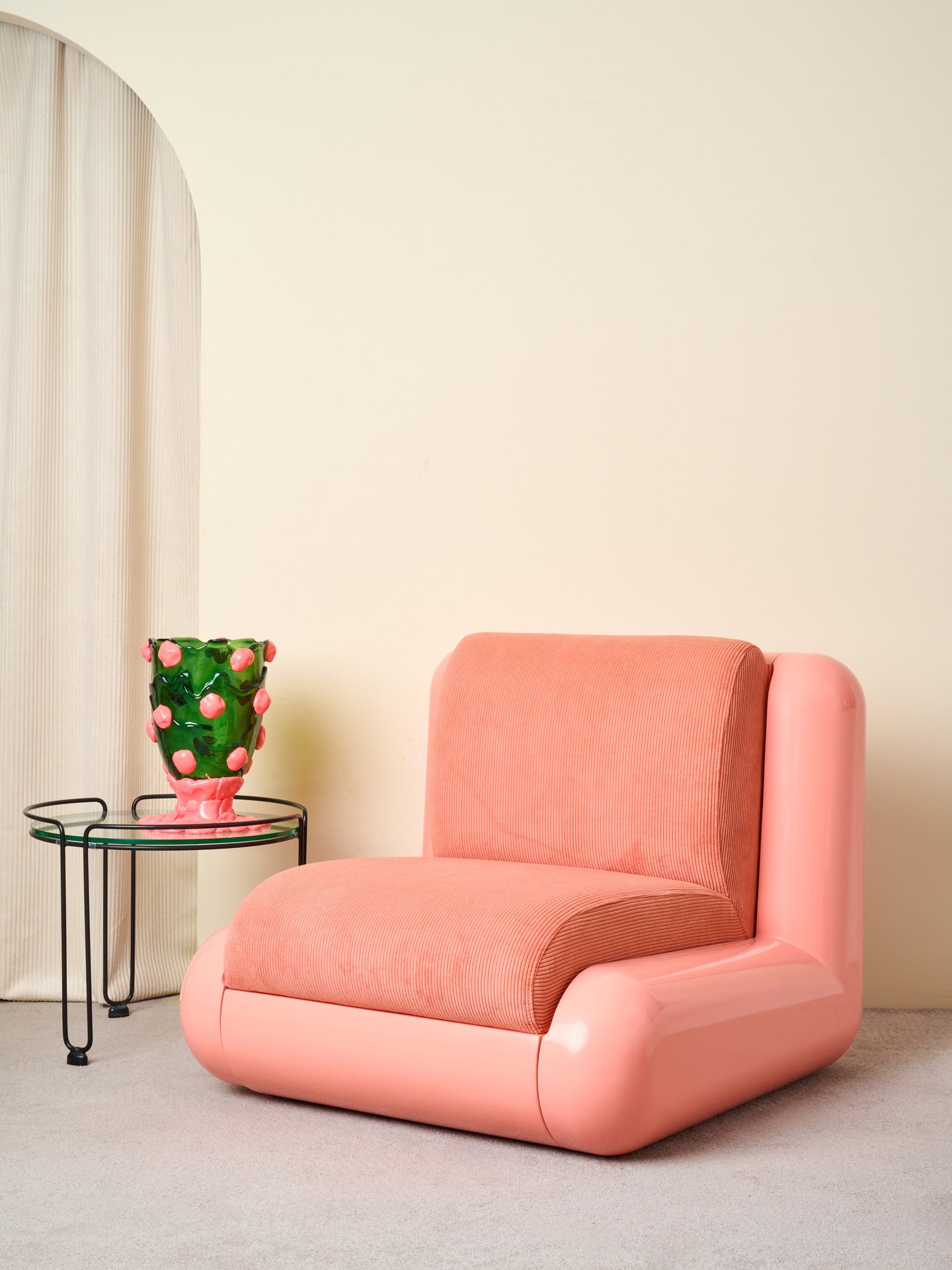 From Big Brother’s Diary Room aesthetic to the golden era of the chat show sofa, the new collection plays homage to the visual language of colorful onscreen scenography that dominated before the turn of the millenium.