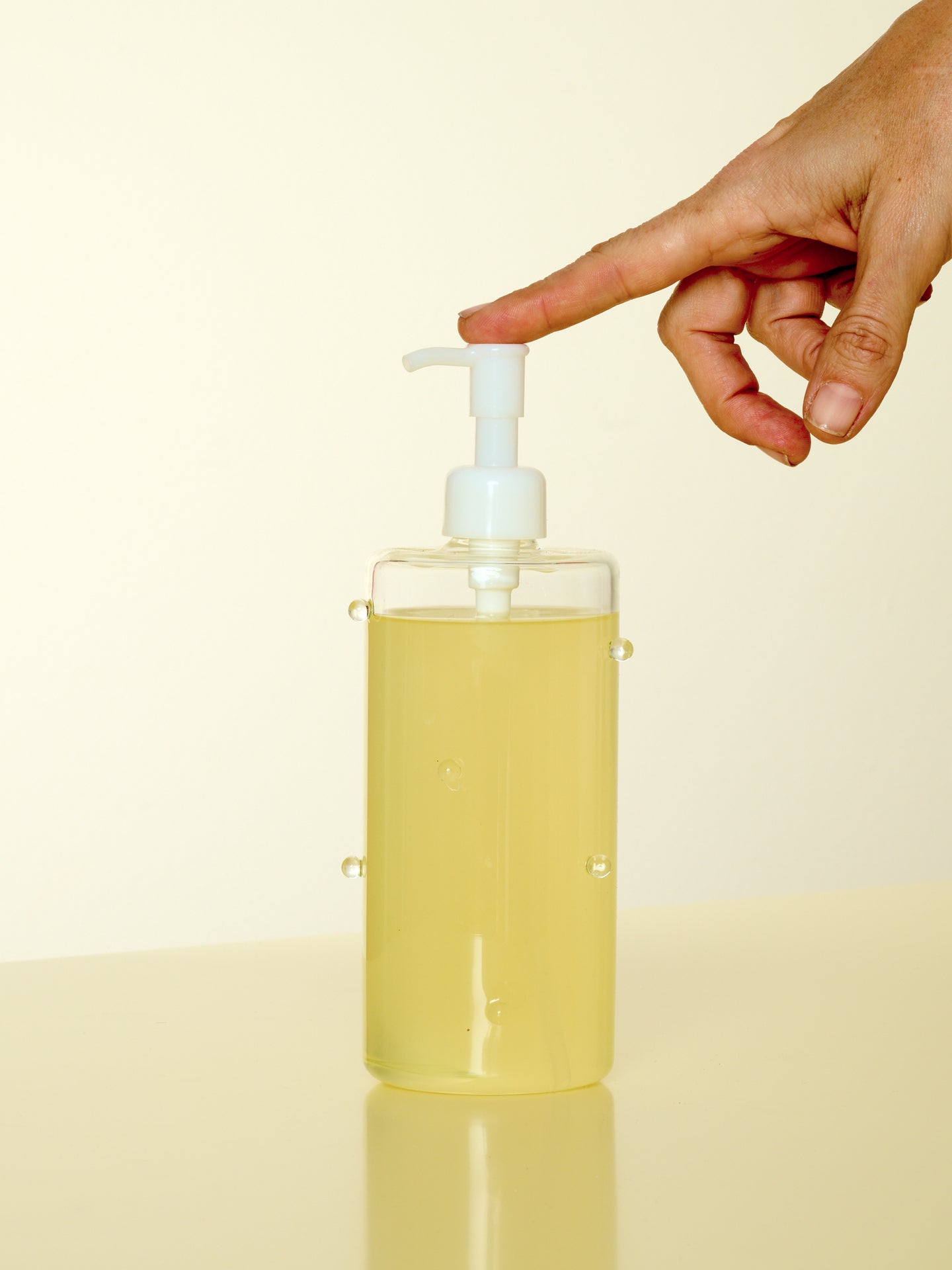 This playful glass bottle really can do anything! Featuring a sleek body, elegant glass beads and a minimal pump design, fill it with dish wash or hand soap to beautify any room with running water. Fill it with any other liquid soap of your choice! Available individually in two colorways. Hand and body wash available optionally.
