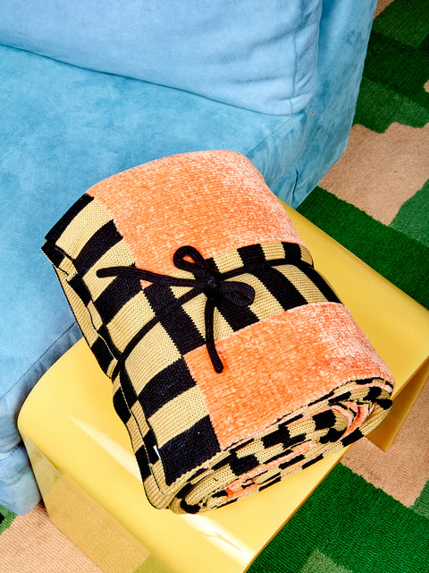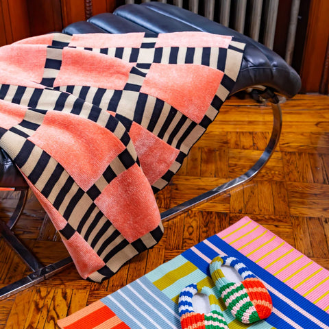 Colorblocked knit throw with two-tone dimensional chenille stripes. Mix and match with contrasting patterns or layer with coordinating pillows for a high-impact look. Fully reversible. Available in two colorways.