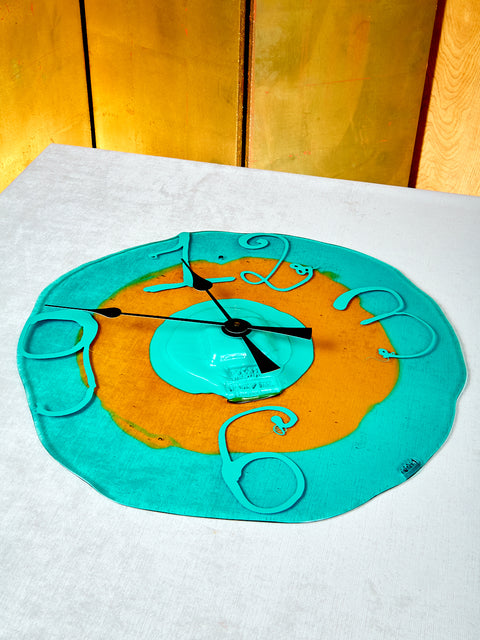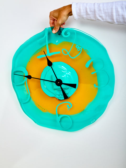 Vibrant hand-made resin clock designed by Gaetano Pesce for Fish Design. Each piece is uniquely made in Italy and may feature slight differences. A small hole allows this clock to be hung by a single nail.